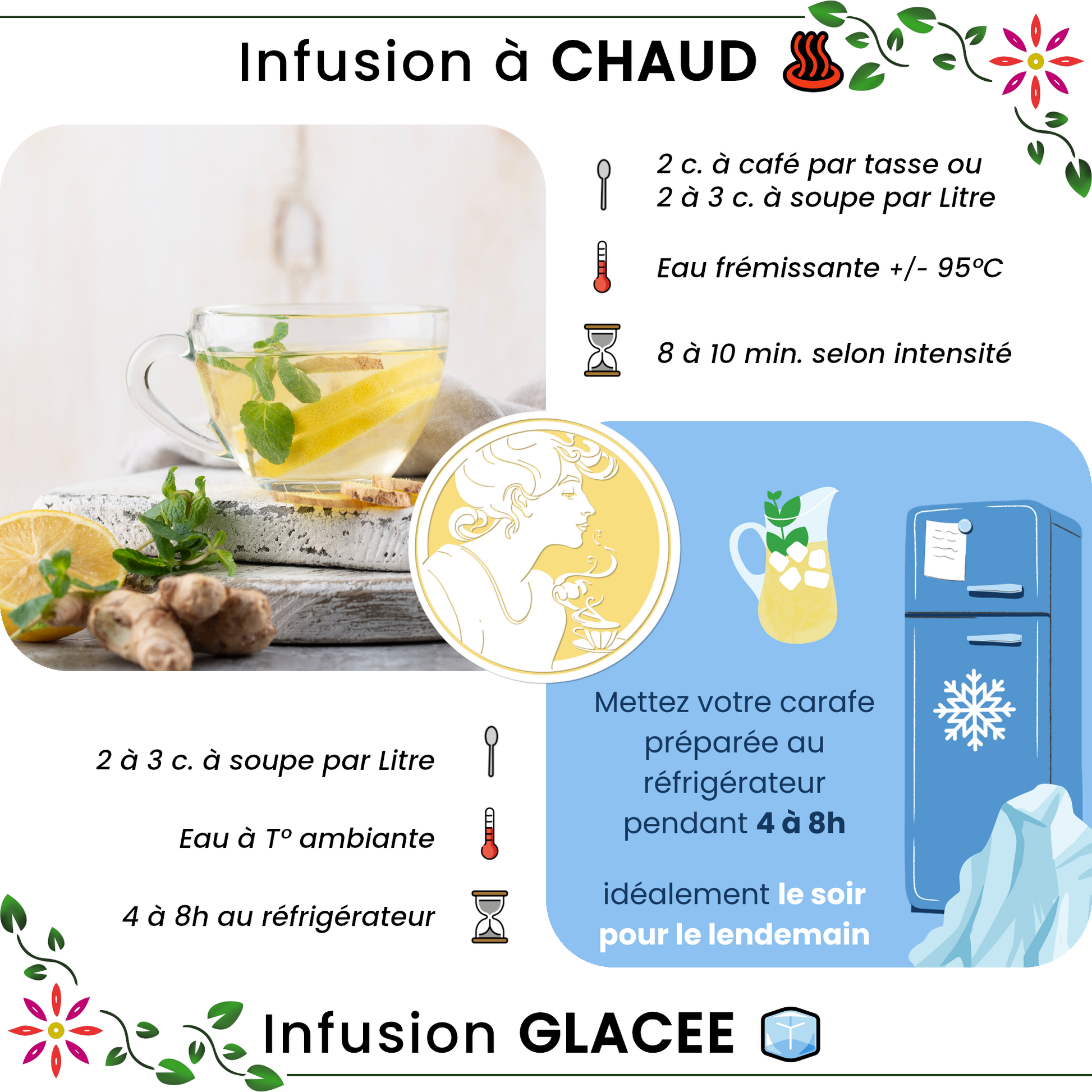 • Infusez également 3 g pour 30 cl d'eau à température ambiante pendant 60 à 90 minutes, ou